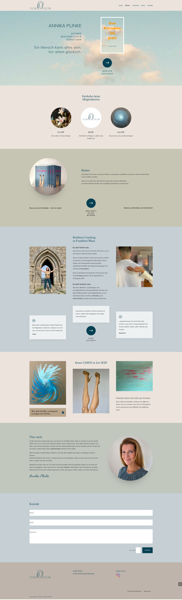 Die Website vereint die drei beruflichen Säulen der Kundin – Resilienz Coaching, Autorinnentätigkeit und künstlerisches Schaffen – in einem harmonischen, klar strukturierten Design. Ziel war es, Persönlichkeit, Professionalität und Kreativität sichtbar zu machen.